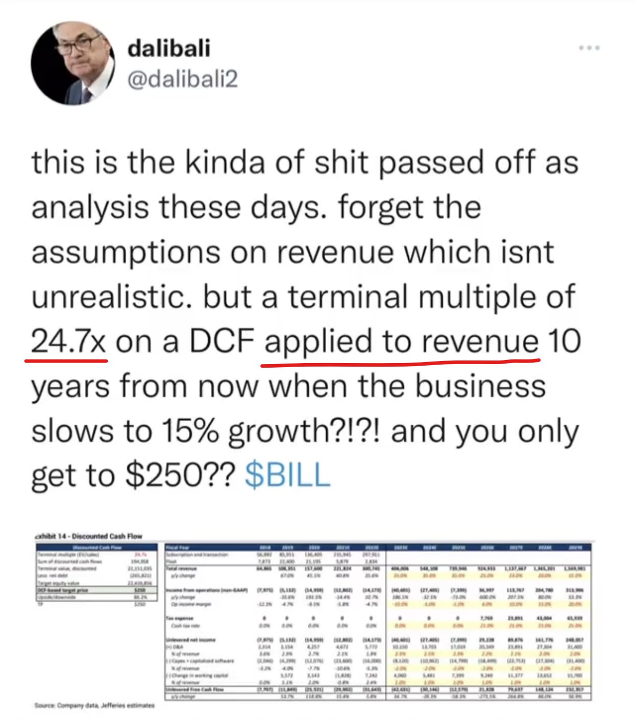 This is why the sell-side gets mocked—you can’t slap a 24.7× SALES exit multiple on a SaaS company and barely catch up to the stock price. If buy-siders can see through it and roast the analyst on Twitter, you’re dead in every buy-side interview pulling the same stunt.